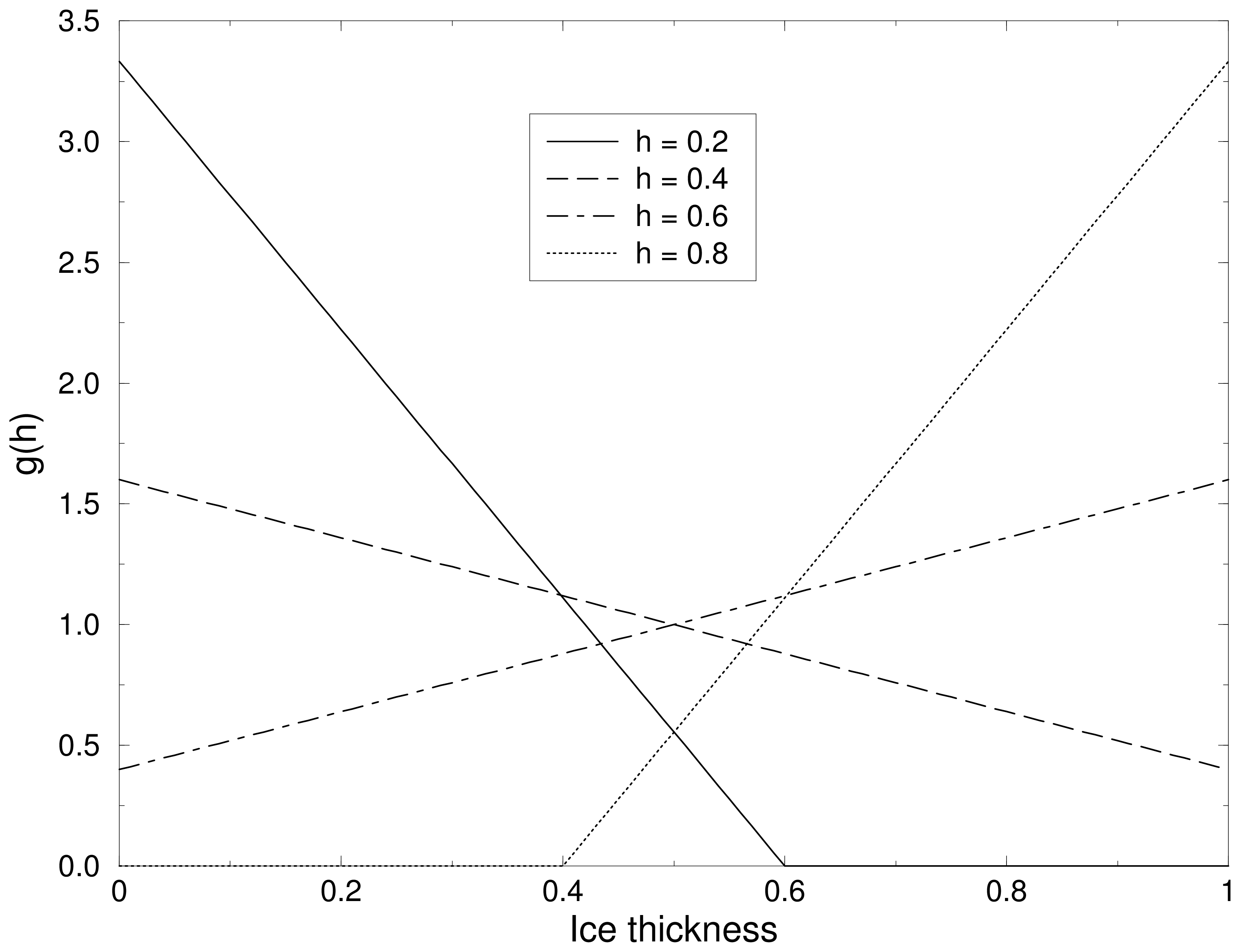 Figure Linear approximation of thickness distribution function illustrates the linear reconstruction of \(g\) for the simple cases \(H_L = 0\), \(H_R = 1\), \(a_n = 1\), and \(h_n =\) 0.2, 0.4, 0.6, and 0.8. Note that \(g\) slopes downward (\(g_1 < 0\)) when \(h_n\) is less than the midpoint thickness, \((H_L + H_R)/2 = 1/2\), and upward when \(h_n\) exceeds the midpoint thickness. For \(h_n = 0.2\) and 0.8, \(g = 0\) over part of the range.